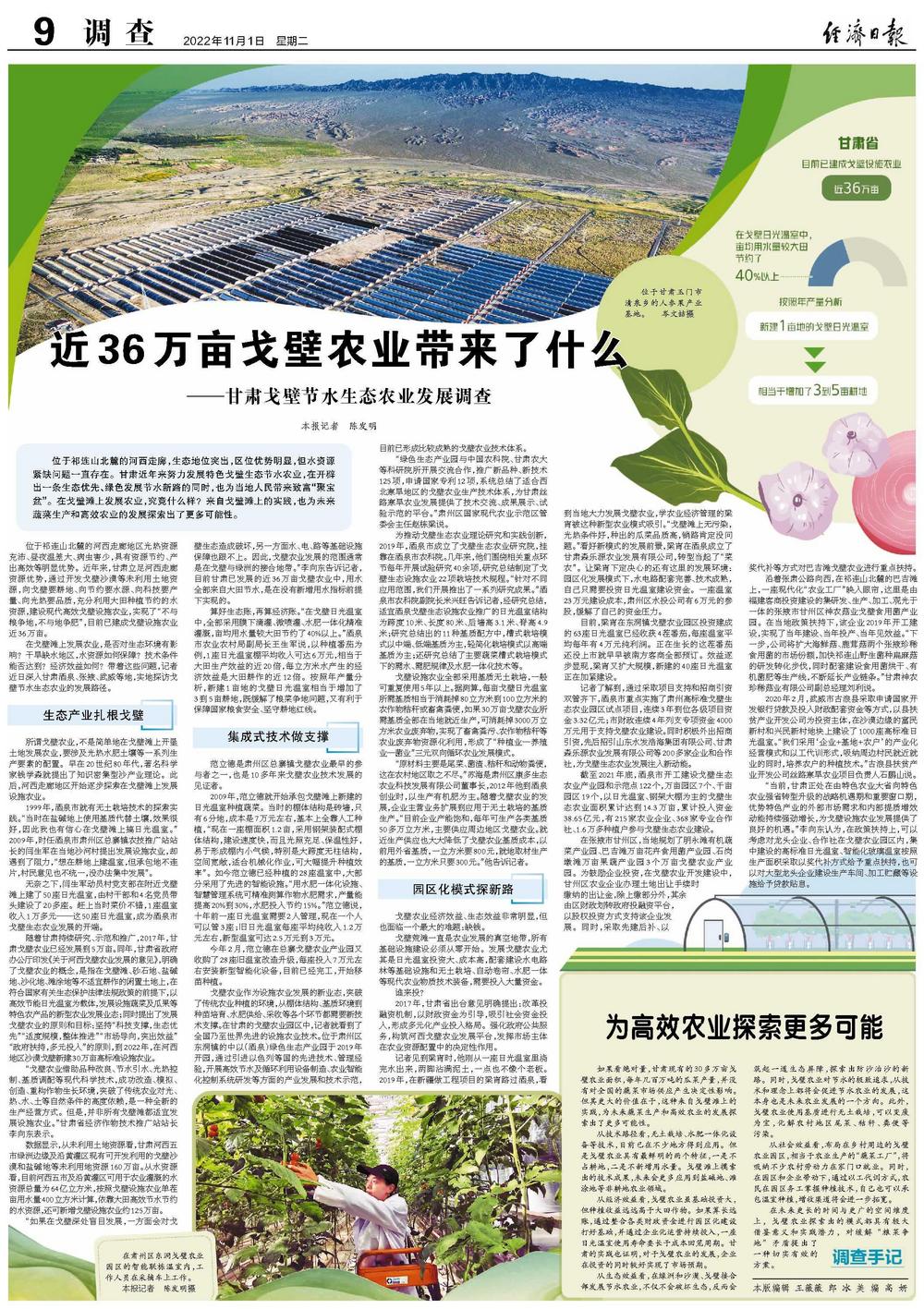 在戈壁滩上发展农业,是否对生态环境有影响?干旱缺水地区,水资源如何保障?技术条件能否达到?经济效益如何?带着这些问题,记者近日深入甘肃酒泉、张掖、武威等地,实地探访戈壁节水生态农业的发展路径。