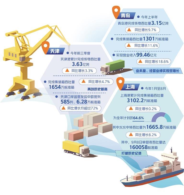 在天津,“直提直装”新模式广获好评。今年8月份,天津口岸进口集装箱货物实施“船边直提”作业比例达35%,出口集装箱货物通过“抵港直装”模式在码头运抵后24小时内装船的比例达28%。