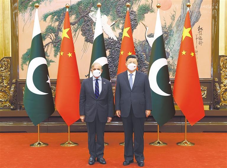 习近平介绍了中国共产党第二十次全国代表大会取得的重要成果。习近平指出,中国将继续坚持对外开放基本国策,不断以中国新发展为包括巴基斯坦在内的世界各国提供新机遇。中方愿同巴方深化发展战略对接。双方要用好中巴经济走廊联合合作委员会机制,以更高效率推进中巴经济走廊建设,将其打造成“一带一路”高质量发展示范性工程。要加快推进瓜达尔港配套基础设施建设,发挥港口对地区联通发展的辐射带动作用。双方要共同努力,为早日实施一号铁路干线升级改造项目和卡拉奇环城铁路项目创造条件。中方欢迎巴基斯坦扩大优质农产品对华出口,愿同巴方拓展数字经济、电子商务、光伏等新能源合作,扎实推进农业、科技、民生等领域合作,将继续为巴方稳定金融形势提供力所能及的支持。中方支持中国工业强省同巴方结对子推进产业合作,希望巴方提供良好营商环境。我高度牵挂在巴中国人的安全问题,希望巴方为赴巴基斯坦开展合作的中国机构和人员提供可靠安全环境。