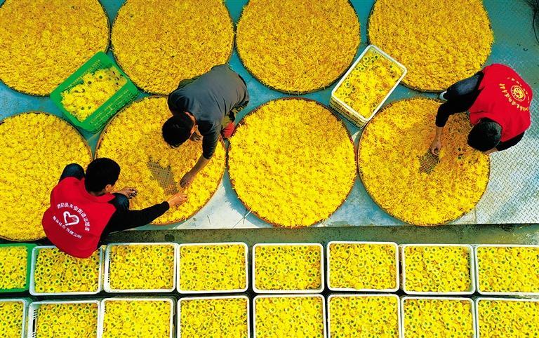 11月1日,江苏省宿迁市泗阳县来安街道东和平社区农业生态园烘干车间内,志愿者帮助工人对采收的金丝皇菊进行摆盘,准备入库烘烤。近年来,泗阳县大力培育壮大龙头企业,打造特色产业,助力乡村振兴。裴 成摄(中经视觉)