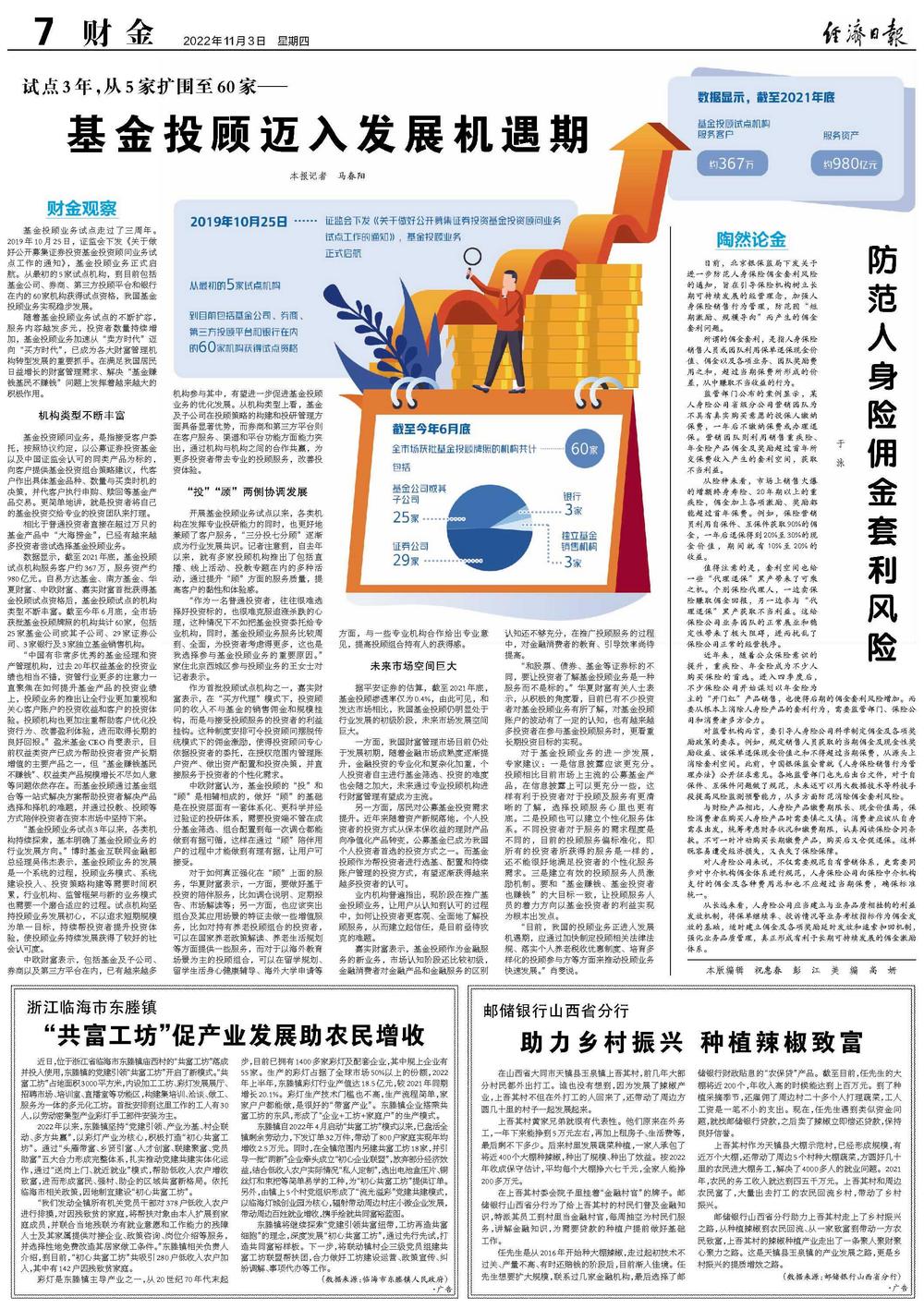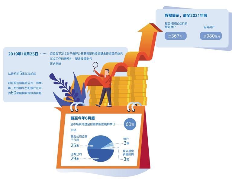 数据显示,截至2021年底,基金投顾试点机构服务客户约367万,服务资产约980亿元。自易方达基金、南方基金、华夏财富、中欧财富、嘉实财富首批获得基金投顾试点资格后,基金投顾试点的机构类型不断丰富。截至今年6月底,全市场获批基金投顾牌照的机构共计60家,包括25家基金公司或其子公司、29家证券公司、3家银行及3家独立基金销售机构。