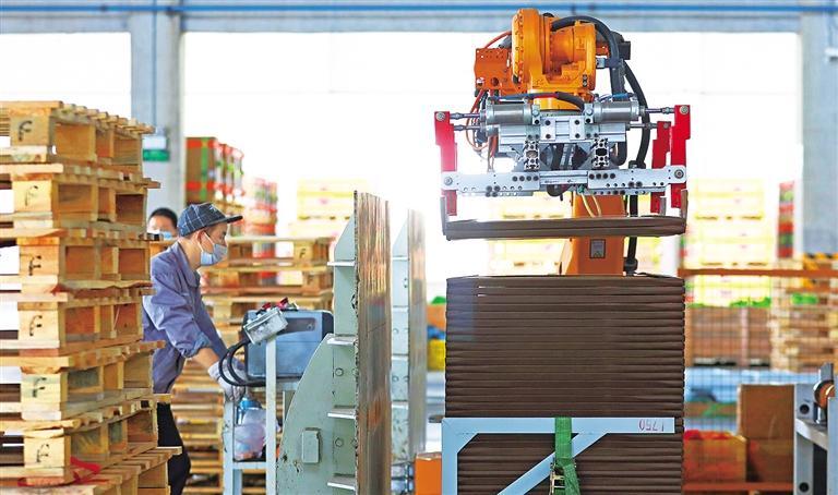 位于江西省丰城市上塘镇的唯美陶瓷有限公司加大科研投入力度,优化生产布局,产品不断提档升级,销售市场实现突破,陶瓷产品远销60多个国家和地区。图为公司车间内,机械手臂在进行岩板瓷砖生产。王 堃摄(中经视觉)