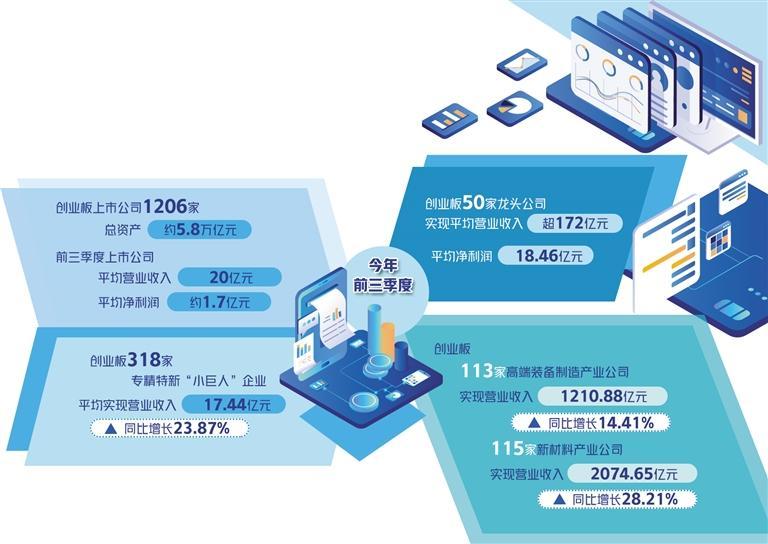 上市公司1206家、总资产约5.8万亿元,前三季度平均营业收入20亿元、平均净利润约1.7亿元……今年以来,创业板持续发挥资本市场作用,以更大覆盖面、更强包容性为创新创业企业赋能,推动一大批优秀企业做优做强。