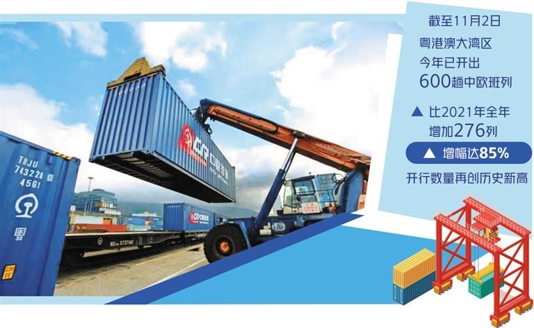 2022年11月2日,随着一声响亮的汽笛长鸣,满载着100个集装箱货物的X8186次中欧班列从广铁集团增城西物流园缓缓驶出,将经由霍尔果斯口岸出境奔赴欧洲。这是粤港澳大湾区中欧班列今年开出的第600趟中欧班列,比2021年全年增加276列,增幅达85%,开行数量再创新高。