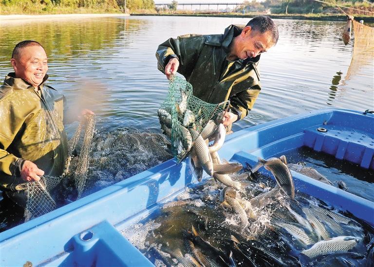 ①11月4日,江西省宜丰县棠浦镇毛家村,村民在养殖基地忙捕捞。该县大力发展淡水鱼虾、生态鳗鱼等水产业,助农增收致富。