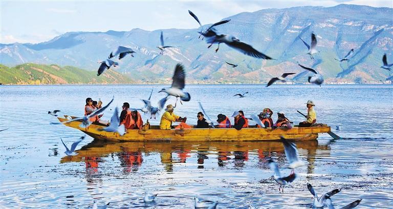 ⑥10月31日,游人在云南省丽江泸沽湖游玩。泸沽湖美景吸引无数游客纷至沓来。赵庆祖摄(中经视觉)
