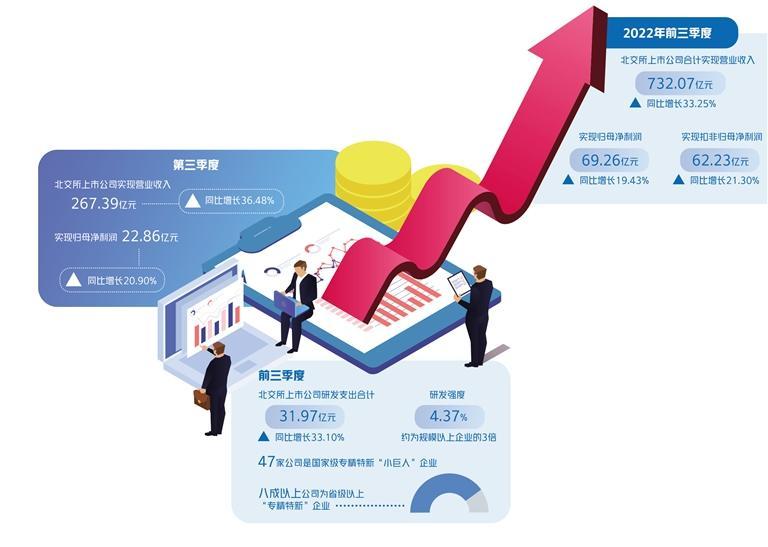目前北交所上市公司中,中小企业占比超76%,战略性新兴产业、先进制造业等占比超八成,覆盖工业材料、医药健康、“双碳”、消费等多元细分创新领域,以创新引领发展,专注攻克关键核心技术,持续加大研发力度。前三季度,研发支出合计31.97亿元,同比增长33.10%,研发强度达4.37%,约为规模以上企业的3倍。47家公司是国家级专精特新“小巨人”企业,八成以上公司为省级以上“专精特新”企业。微创光电等6家公司研发强度超20%,连城数控等4家公司的研发支出达1亿元以上。部分公司突破“卡脖子”技术,实现进口替代,发展动能得到充分释放。利通科技研发推出超耐磨酸化压裂软管等高附加值产品,前三季度净利润同比增长98.58%;富士达主导制定的IEC国际标准发布,标志着公司在射频同轴电缆组件领域保持着国际技术领先地位。中央财经大学证券期货研究所所长贺强认为,北交所上市公司“小而美”特征突出,涵盖了中小企业技术创新、产品创新、管理创新和商业模式创新等多元化创新形态。