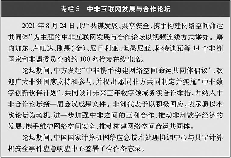 加强与周边和广大发展中国家网信合作。中国—东盟信息港论坛连续成功举办,持续推动中国与东盟国家数字领域合作,建立中国—东盟网络事务对话机制。建立中日韩三方网络磋商机制。与韩国联合主办中韩互联网圆桌会议。举办中非互联网发展与合作论坛,发布“中非携手构建网络空间命运共同体倡议”,提出了“中非数字创新伙伴计划”。中国—南非新媒体圆桌会议、中坦(坦桑尼亚)网络文化交流会、中肯(肯尼亚)数字经济合作发展研讨会等活动加强了中非在新媒体、网络文化、数字经济等领域交流合作。举办多届网上丝绸之路大会,在信息基础设施、跨境电子商务、智慧城市等领域与阿拉伯国家开展务实合作。举办中古(古巴)互联网圆桌论坛、中巴(巴西)互联网治理研讨会,围绕信息时代互联网的发展与治理开展对话交流。与亚非国家开展网络法治对话。2015年4月,亚洲—非洲法律协商组织(“亚非法协”)第54届年会在北京举行。在中方建议下,“亚非法协”决定设立“网络空间国际法工作组”。工作组围绕相关议题深入开展讨论。