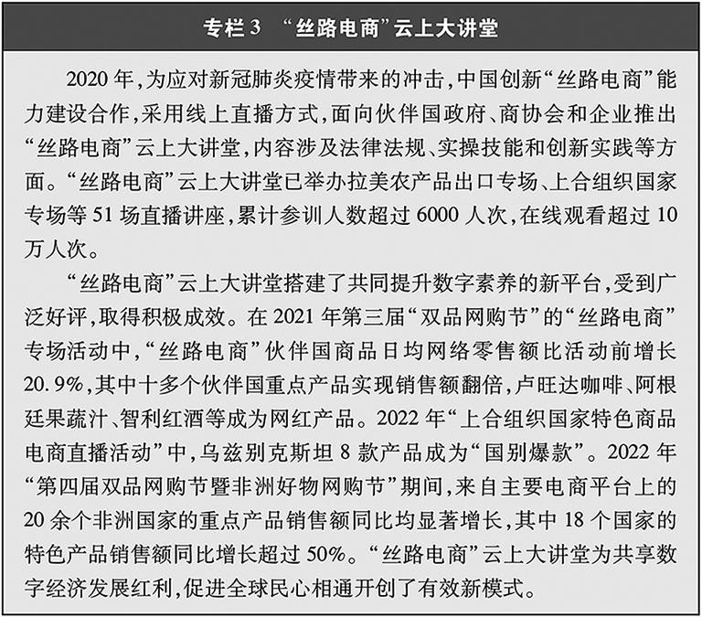 “丝路电商”合作成果丰硕。自2016年以来,中国与五大洲23个国家建立双边电子商务合作机制,建立中国—中东欧国家、中国—中亚五国电子商务合作对话机制,通过政企对话、联合研究、能力建设等推动多层次交流合作,营造良好发展环境,构建数字合作格局。电子商务企业加速“出海”,带动跨境物流、移动支付等各领域实现全球发展。积极参与世界贸易组织、二十国集团、亚太经合组织、金砖国家、上合组织等多边和区域贸易机制下的电子商务议题讨论,与自贸伙伴共同构建高水平数字经济规则。电子商务国际规则构建取得突破,区域全面经济伙伴关系协定电子商务章节成为目前覆盖区域最广、内容全面、水平较高的电子商务国际规则。