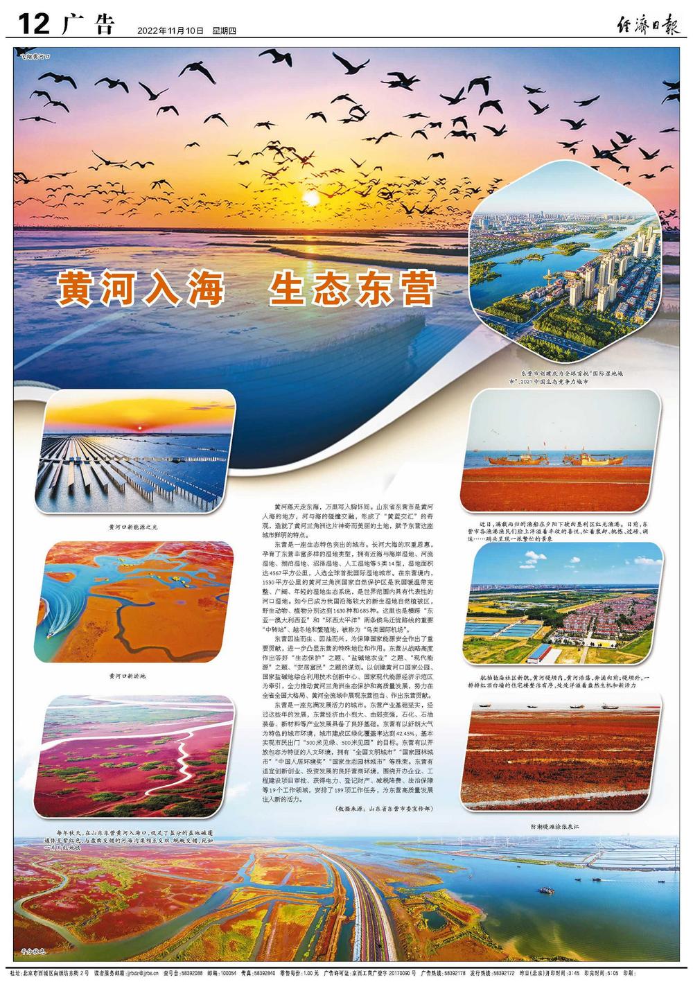 东营是一座生态特色突出的城市。长河大海的双重恩惠,孕育了东营丰富多样的湿地类型,拥有近海与海岸湿地、河流湿地、湖泊湿地、沼泽湿地、人工湿地等5类14型,湿地面积达4567平方公里,入选全球首批国际湿地城市。在东营境内,1530平方公里的黄河三角洲国家自然保护区是我国暖温带完整、广阔、年轻的湿地生态系统,是世界范围内具有代表性的河口湿地。如今已成为我国沿海较大的新生湿地自然植被区,野生动物、植物分别达到1630种和685种。这里也是横跨“东亚—澳大利西亚”和“环西太平洋”两条候鸟迁徙路线的重要“中转站”、越冬地和繁殖地,被称为“鸟类国际机场”。