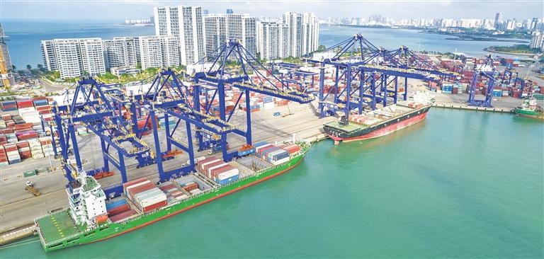 11月12日,海口港集装箱码头停泊多艘集装箱船,装卸繁忙。今年前10个月,海南货物贸易进出口1626.8亿元,已超过去年全年进出口总值。张俊其摄(中经视觉)