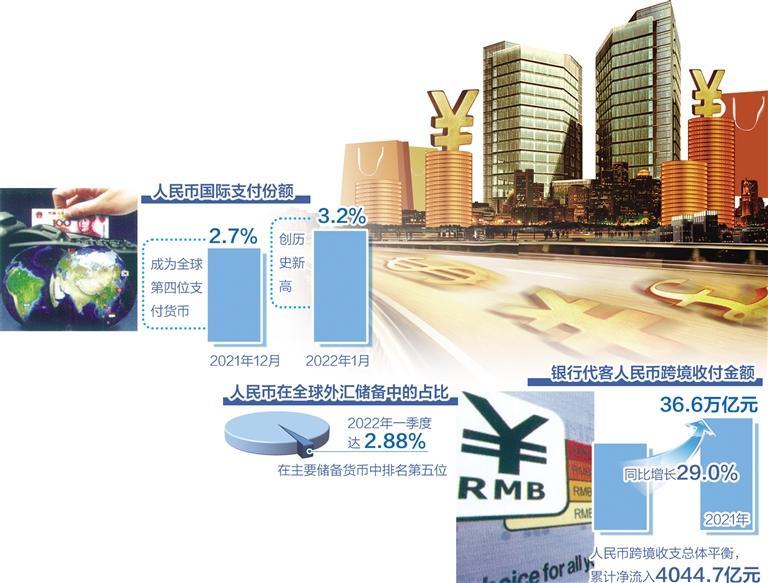 不断创新高的还有人民币的储备货币功能。国际货币基金组织(IMF)发布的官方外汇储备货币构成(COFER)数据显示,2022年一季度,人民币在全球外汇储备中的占比达2.88%,较2016年人民币刚加入特别提款权(SDR)货币篮子时上升1.8个百分点,在主要储备货币中排名第五位。据不完全统计,有80多个境外央行或货币当局将人民币纳入外汇储备。