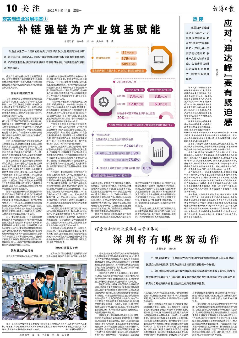 近年来,江西加快推进产业链科技创新联合体建设,推动产业链上中下游、大中小企业融通创新。如围绕产业链发展共性需求,布局建设一批专业水平高、服务能力强、支撑力度大的公共服务平台,截至2021年年底,江西全省建成综合平台83个、民航适航审定中心等专业平台1577个。“依托创新平台,公司积极研发新技术新产品,目前以动力电池系统为核心,上游延伸到矿产原材料、电芯正负极材料等关键环节,下游延伸至储能、动力电池回收利用等产业,在稳链补链强链上走出一条自主可控之路。”南昌欣旺达新能源有限公司政府事务部主任张秀玲说。