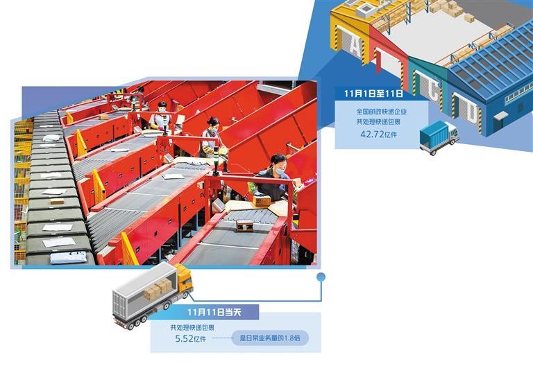 “双11”的快递都收到了吗?国家邮政局监测数据显示,11月1日至11日,全国邮政快递企业共处理快递包裹42.72亿件,日均处理量是日常业务量的1.3倍。其中,11月11日当天共处理快递包裹5.52亿件,是日常业务量的1.8倍。