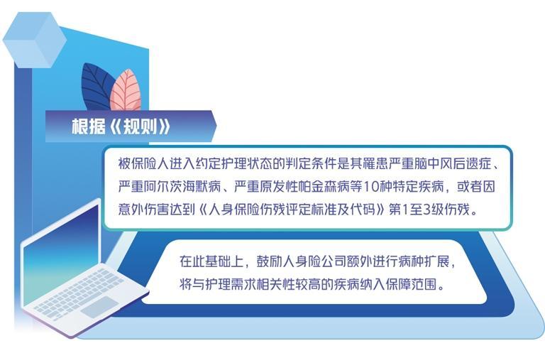 根据《规则》,被保险人进入约定护理状态的判定条件是其罹患严重脑中风后遗症、严重阿尔茨海默病、严重原发性帕金森病等10种特定疾病,或者因意外伤害达到《人身保险伤残评定标准及代码》第1至3级伤残。在此基础上,鼓励人身险公司额外进行病种扩展,将与护理需求相关性较高的疾病纳入保障范围。