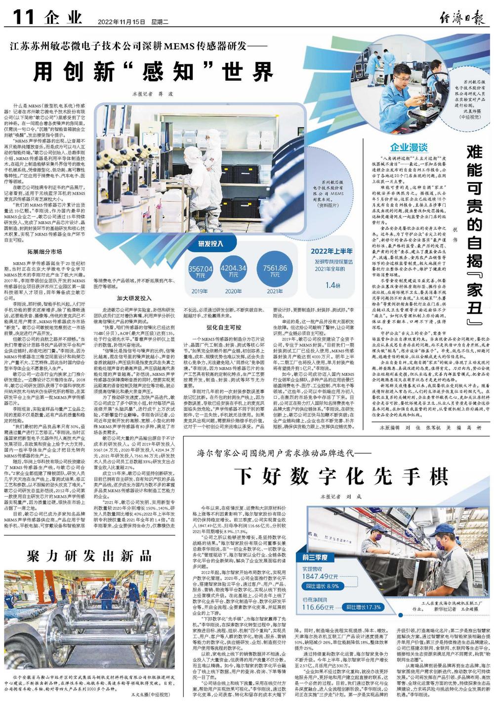如今,敏芯公司成功迈入国内MEMS行业领军企业梯队,多种产品的应用场景已涵盖消费电子、医疗、工业控制、汽车电子等领域。“这些年,公司以中低端应用为切入口,在激烈的市场竞争中存活了下来。目前,公司正在努力打入国际知名消费类电子品牌大客户的供应链体系。”李刚说,在研发创新上,敏芯公司正快马加鞭不断突破;在全产业链构建上,企业也在不断完善、补齐短板,确保供货能力跟上,发挥供应链优势。