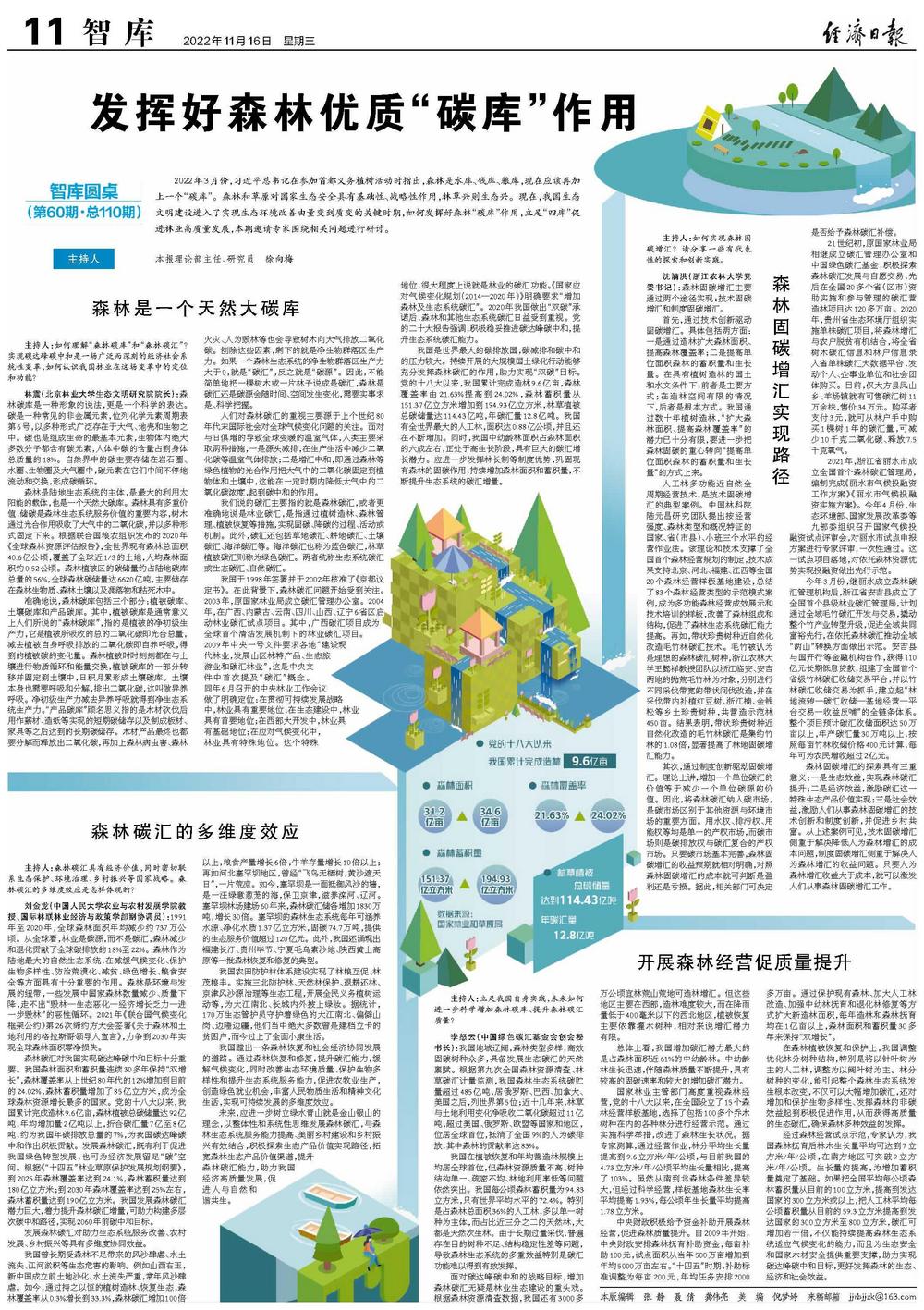 2022年3月份,习近平总书记在参加首都义务植树活动时指出,森林是水库、钱库、粮库,现在应该再加上一个“碳库”。森林和草原对国家生态安全具有基础性、战略性作用,林草兴则生态兴。现在,我国生态文明建设进入了实现生态环境改善由量变到质变的关键时期,如何发挥好森林“碳库”作用,立足“四库”促进林业高质量发展,本期邀请专家围绕相关问题进行研讨。