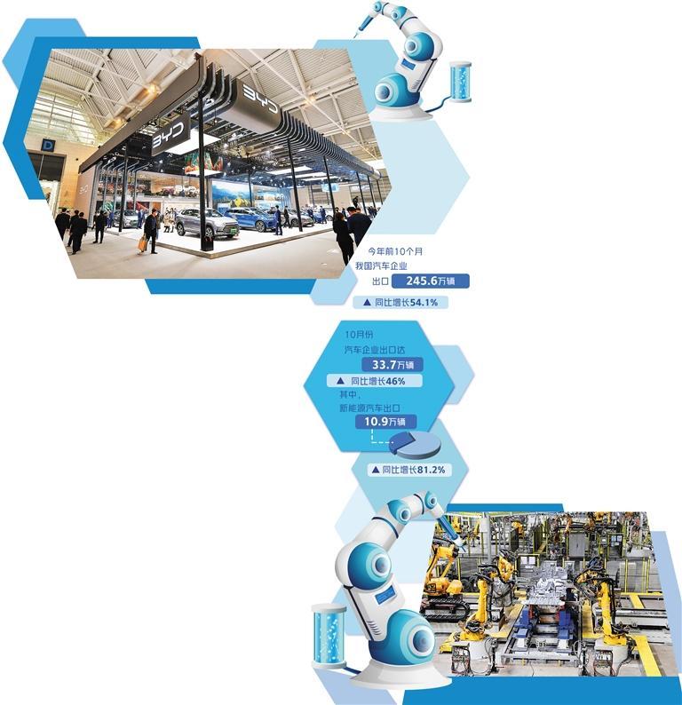 中国汽车工业协会最新数据显示,今年前10个月,我国汽车企业出口245.6万辆,同比增长54.1%。