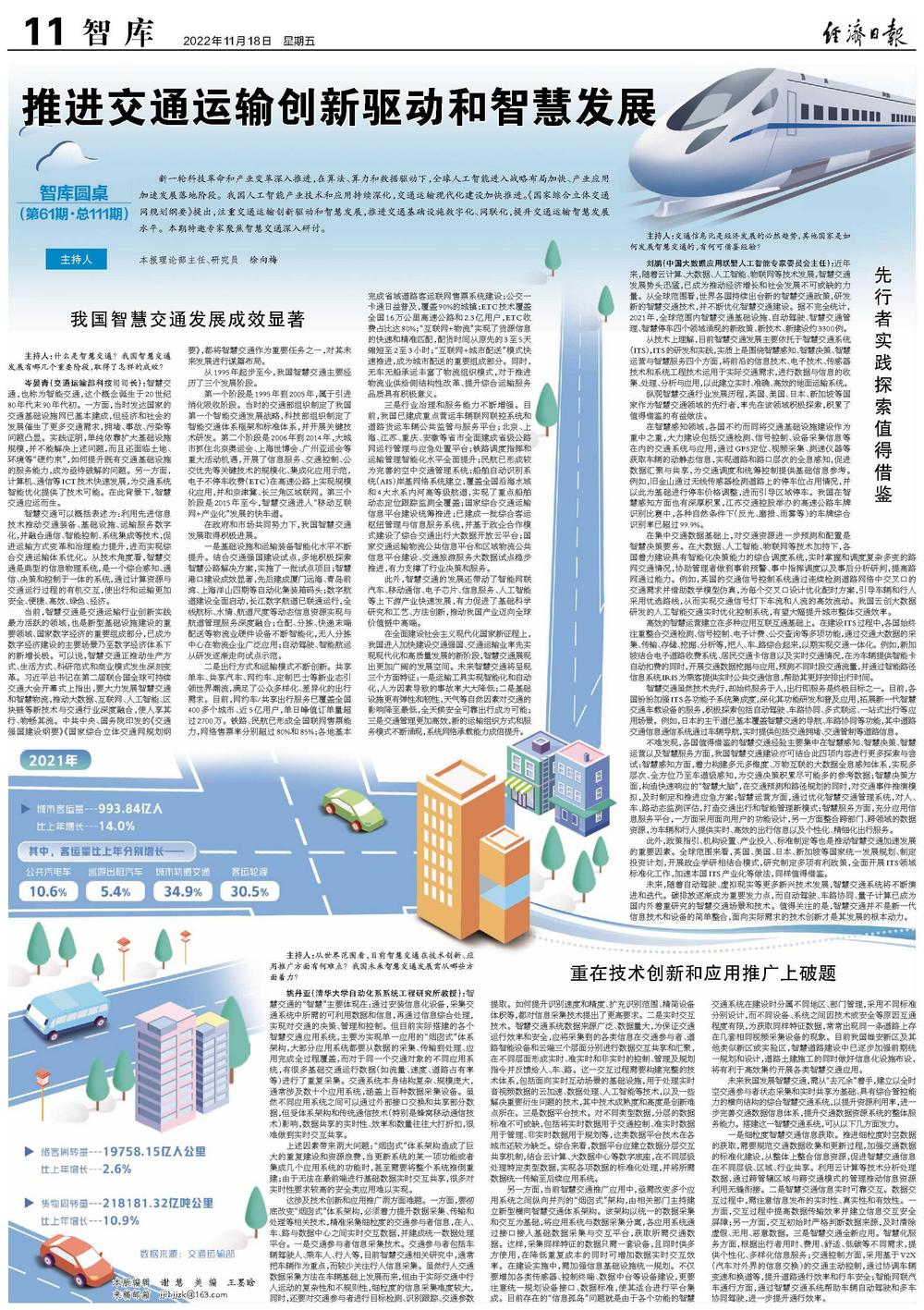 新一轮科技革命和产业变革深入推进,在算法、算力和数据驱动下,全球人工智能进入战略布局加快、产业应用加速发展落地阶段。我国人工智能产业技术和应用持续深化,交通运输现代化建设加快推进。《国家综合立体交通网规划纲要》提出,注重交通运输创新驱动和智慧发展,推进交通基础设施数字化、网联化,提升交通运输智慧发展水平。本期特邀专家聚焦智慧交通深入研讨。