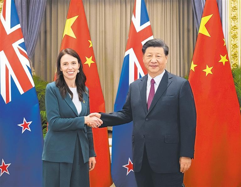 习近平指出,总理女士多次表示,新西兰坚持独立外交政策,中新关系是新西兰最重要的双边关系之一,双方要在具有共同利益的领域开展合作。我对此高度赞赏。今年是中新建交50周年。50年来,中新关系保持健康稳定发展,两国各领域合作给两国人民带来福祉,为地区和平、稳定、繁荣作出积极贡献。中方视新西兰为重要伙伴和朋友。双方要总结历史经验,继续发扬争先精神,推动中新全面战略伙伴关系向前迈进。