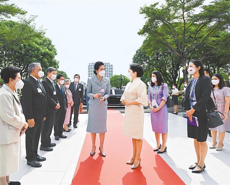 彭丽媛抵达时,娜拉蓬及泰国高教科研与创新部部长阿内、有关内阁部长夫人、甘拉雅尼音乐学院理事会主席比亚沙坤、院长初维等热情迎接。学院乐队奏响欢快的鼓乐,学生们挥动鲜花夹道欢迎。彭丽媛与娜拉蓬共同参观学院陈列室,认真听取学院发展历史和对外合作情况介绍,为学院与南京艺术学院建立和发展合作感到高兴。