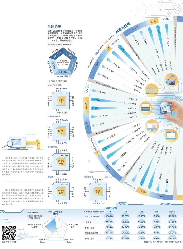 数据显示,数码消费领域百花齐放,从办公到居家、从工作到娱乐涌现出众多新产品,进一步丰富了消费者的选择。其中,家用打印机、Mini-LED显示器、双屏笔记本电脑等广受欢迎,带动消费的同时,也引发了相关产品升级换代的浪潮。