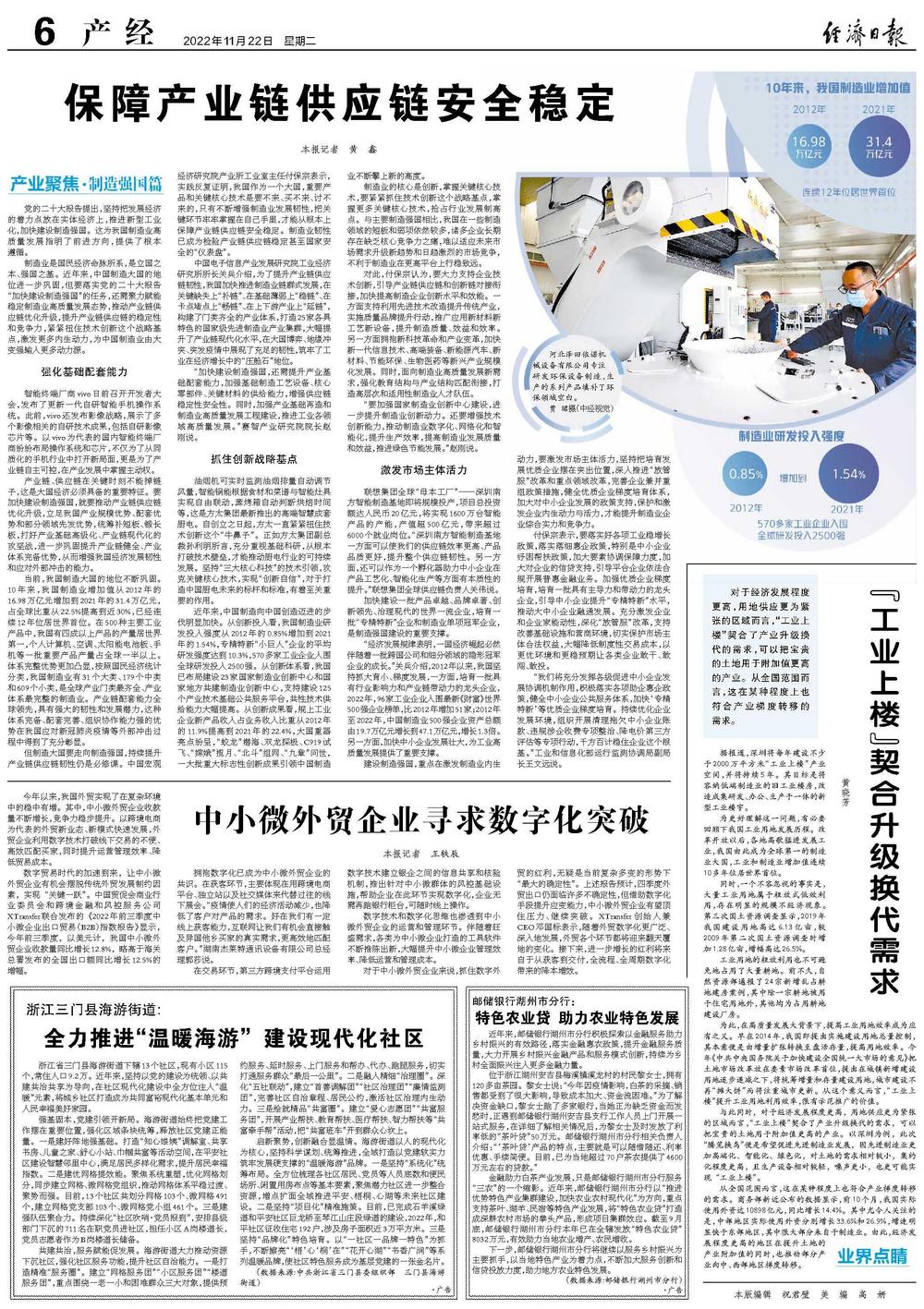 近年来,中国制造向中国创造迈进的步伐明显加快。从创新投入看,我国制造业研发投入强度从2012年的0.85%增加到2021年的1.54%,专精特新“小巨人”企业的平均研发强度达到10.3%,570多家工业企业入围全球研发投入2500强。从创新体系看,我国已布局建设23家国家制造业创新中心和国家地方共建制造业创新中心,支持建设125个产业技术基础公共服务平台,共性技术供给能力大幅提高。从创新成果看,规上工业企业新产品收入占业务收入比重从2012年的11.9%提高到2021年的22.4%,大国重器亮点纷呈,“蛟龙”潜海、双龙探极、C919试飞、“嫦娥”揽月、“北斗”组网、“九章”问世,一大批重大标志性创新成果引领中国制造业不断攀上新的高度。