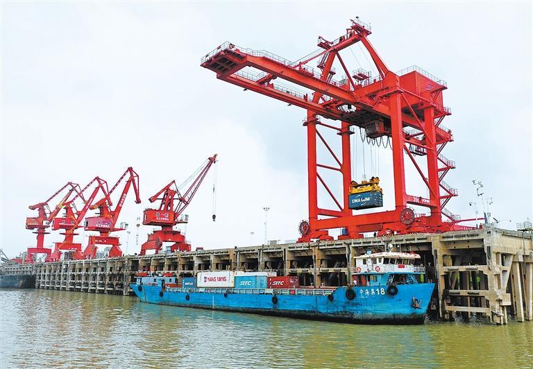 今年以来,安徽铜陵不断优化水路与铁路、公路多式联运,推进口岸建设。1月份至10月份,铜陵港完成港口吞吐量7737.44万吨,同比增长10.70%;完成集装箱吞吐量3.3572万标准箱,同比增长31.11%。图为11月18日,港口机械在铜陵港长江外贸码头装卸货物。过仕宁摄