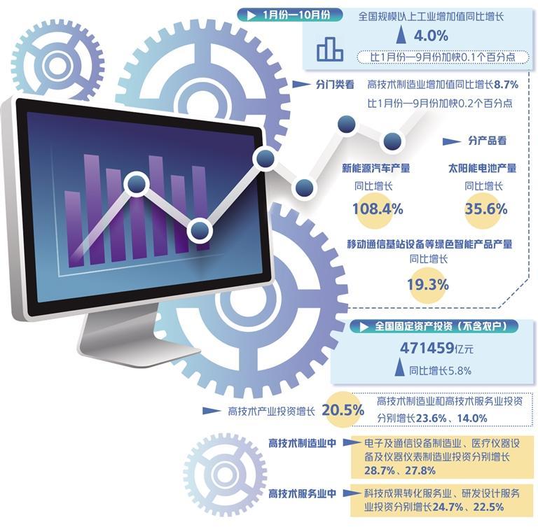 国家统计局日前发布数据显示,10月份,高技术制造业增加值同比增长10.6%,增速比9月份提高1.3个百分点,工业经济引擎作用依旧明显。“我国产业升级发展态势持续,技术含量较高、附加值较高的高技术制造业持续保持较快增长。”国家统计局新闻发言人、国民经济综合统计司司长付凌晖说。