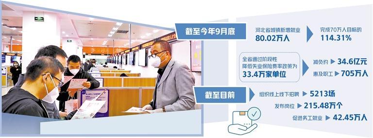 党的二十大报告提出,强化就业优先政策,健全就业促进机制,促进高质量充分就业。健全就业公共服务体系,完善重点群体就业支持体系,加强困难群体就业兜底帮扶。河北省坚持“稳”“保”“促”并举,突出就业优先导向,扎实落实稳经济一揽子政策,全力援企、稳岗、扩就业、保民生、防风险。截至今年9月底,城镇新增就业80.02万人,完成70万人目标的114.31%,就业形势保持总体稳定。