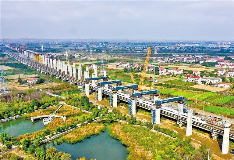 11月22日,新建湖北荆(门)至荆(州)高铁江汉运河2号特大桥5处跨(武)汉宜(昌)铁路钢盖梁施工全部完成。荆荆高铁全长约77公里,设计时速350公里,是我国“八纵八横”高速铁路网中呼(和浩特)南(宁)高铁双通道的重要组成部分。徐云华摄(中经视觉)