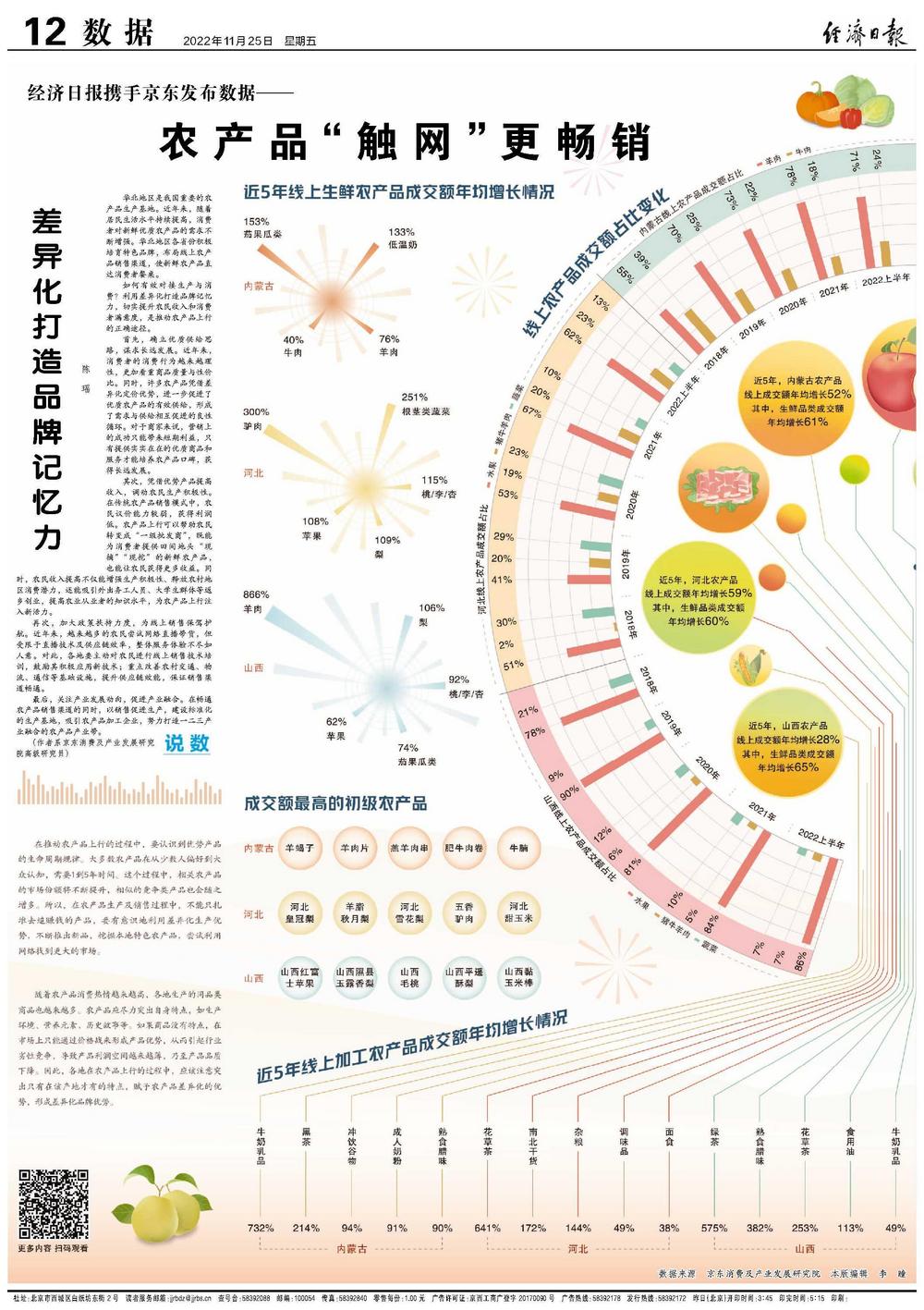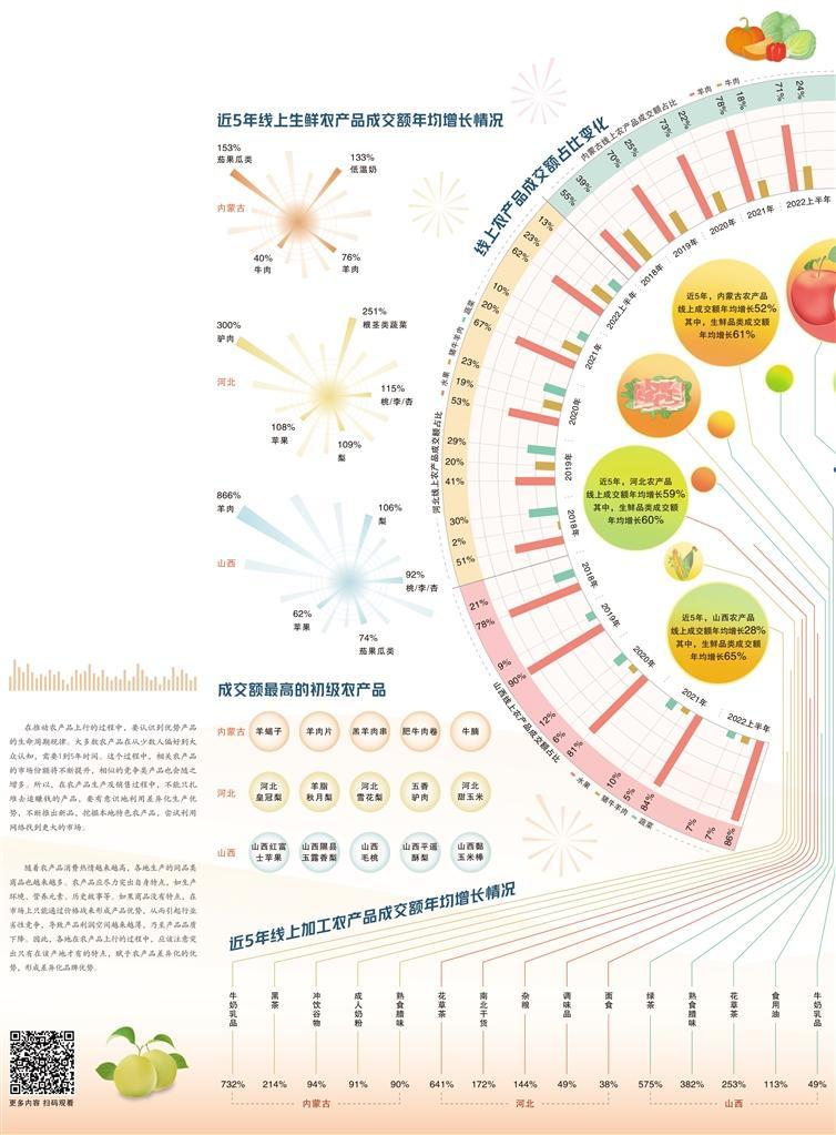 华北地区是我国重要的农产品生产基地。近年来,随着居民生活水平持续提高,消费者对新鲜优质农产品的需求不断增强。华北地区各省份积极培育特色品牌,布局线上农产品销售渠道,使新鲜农产品直达消费者餐桌。