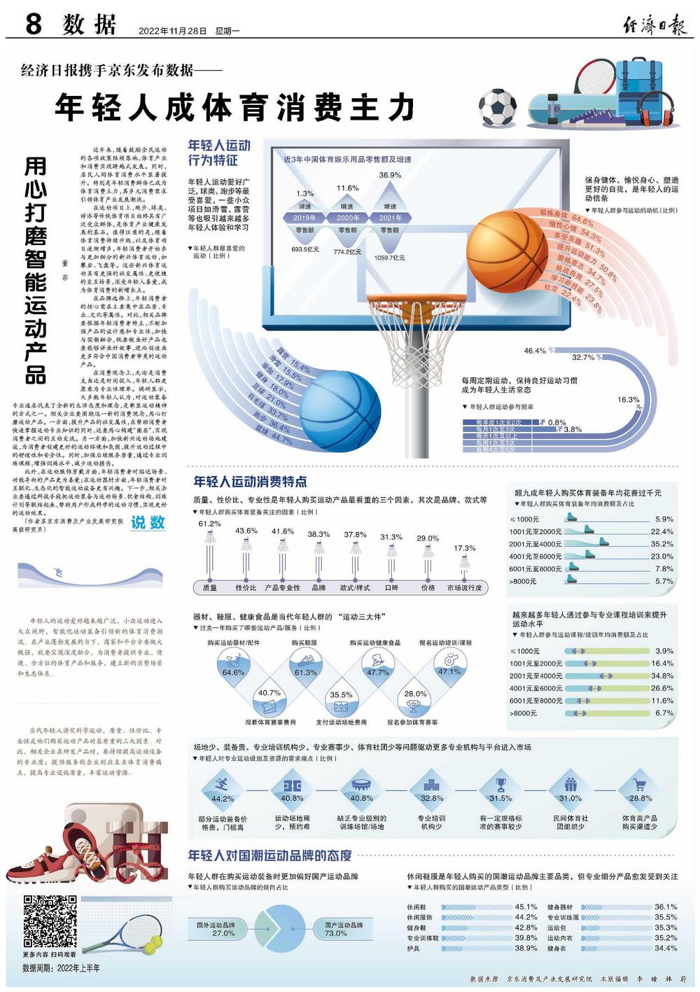 此外,在运动服饰穿戴方面,年轻消费者对贴近场景、功能导向的产品更为喜爱;在运动器材方面,年轻消费者对互联化、生态化的智能运动设备更有兴趣。下一步,相关企业要通过科技手段把运动装备与运动场景、饮食结构、训练计划等联结起来,帮助用户形成科学的运动习惯,实现更好的运动效果。