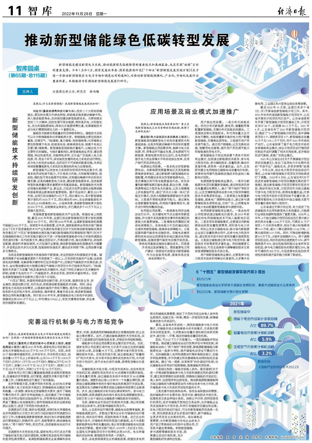 新型储能是建设新型电力系统、推动能源绿色低碳转型的重要技术和基础装备,也是实现“双碳”目标的重要支撑。今年1月和5月,国家发展改革委、国家能源局印发《“十四五”新型储能发展实施方案》《关于进一步推动新型储能参与电力市场和调度运用的通知》,对推动新型储能规模化、产业化、市场化发展作出重要部署。本期邀请专家围绕新型储能发展进行研讨。
