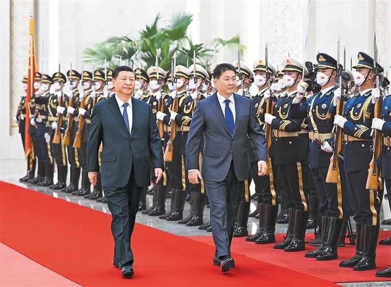 双方发表《中华人民共和国和蒙古国关于新时代推进全面战略伙伴关系的联合声明》,一致同意携手推进现代化建设,朝着共建和平共处、守望相助、合作共赢的两国命运共同体方向作出努力。