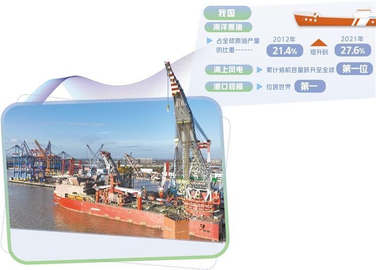 我国海洋原油占全球原油产量的比重由2012年的21.4%提升到2021年的27.6%。海上风电累计装机容量跃升至全球第一位。我国自主研发的兆瓦级潮流能发电机组连续运行时间保持世界领先。