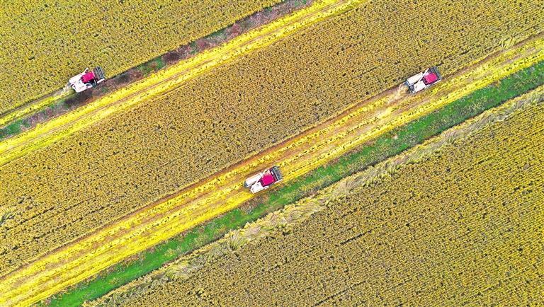 11月26日,安徽省六安市裕安区江家店镇一处“稻虾轮作”农田里,收割机抢收成熟的虾田稻。近年来,当地因地制宜发展稻虾轮作、生态农业、菌菇培育等特色农业,大力推进高标准农田建设,打造绿色粮食标准化生产基地,提升农业质量效益,带动群众增收致富。田凯平摄(中经视觉)