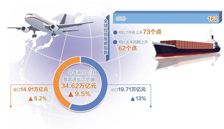 “今年8月份的全球经贸摩擦指数为162,处于高位,相比7月份上升73个点,相比上年同期上升62个点,这表明全球经贸摩擦冲突仍处于较高水平。”在11月29日中国贸促会例行发布会上,中国国际商会秘书长孙晓介绍。