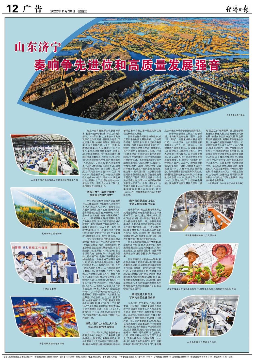 这是一座有着深厚文化积淀的城市,也是一座跃动着生机与活力的现代都市。2022年以来,山东省济宁市充分发挥产业体系完备、创新活力充沛、区位交通优越、城镇布局科学、县域特色突出、农业前景广阔、人文沃土丰厚、生态资源富集、民生保障有力“九大优势”,坚定不移实施制造强市、创新驱动、现代港航物流、济宁都市区建设、县域经济高质量发展、乡村振兴、文化“两创”、生态优先绿色发展、城乡共同富裕“九大战略”,奋力实现“跨入全省发展第一方阵,建设全国文化名市,打造美丽幸福典范城市”奋斗目标。前三季度,实现地区生产总值3968.3亿元,增长4.5%、居全省第3位;一般公共预算收入完成353.6亿元,增长2.8%、居全省前列;规模以上工业增加值增长10%、居全省前列。新时代社会主义现代化强市建设迈出坚实步伐。