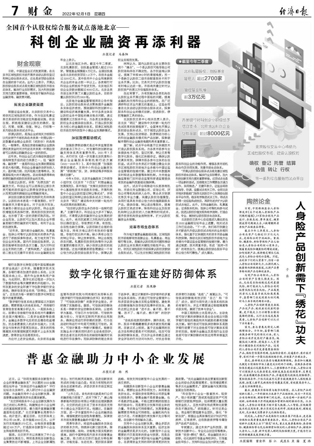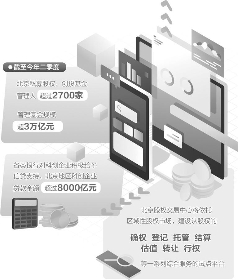 以北京地区为例,截至今年二季度,北京私募股权、创投基金管理人超过2700家,管理基金规模超3万亿元。全国创投基金在北京的投资项目1.2万个,在投本金超过2200亿元,其中投向中小企业和高新技术企业的本金占到一半以上。各类银行对科创企业积极给予信贷支持,北京地区科创企业贷款余额超过8000亿元。北京各类市场主体开展了大量认股权业务,目前存量认股权协议约3300笔。
