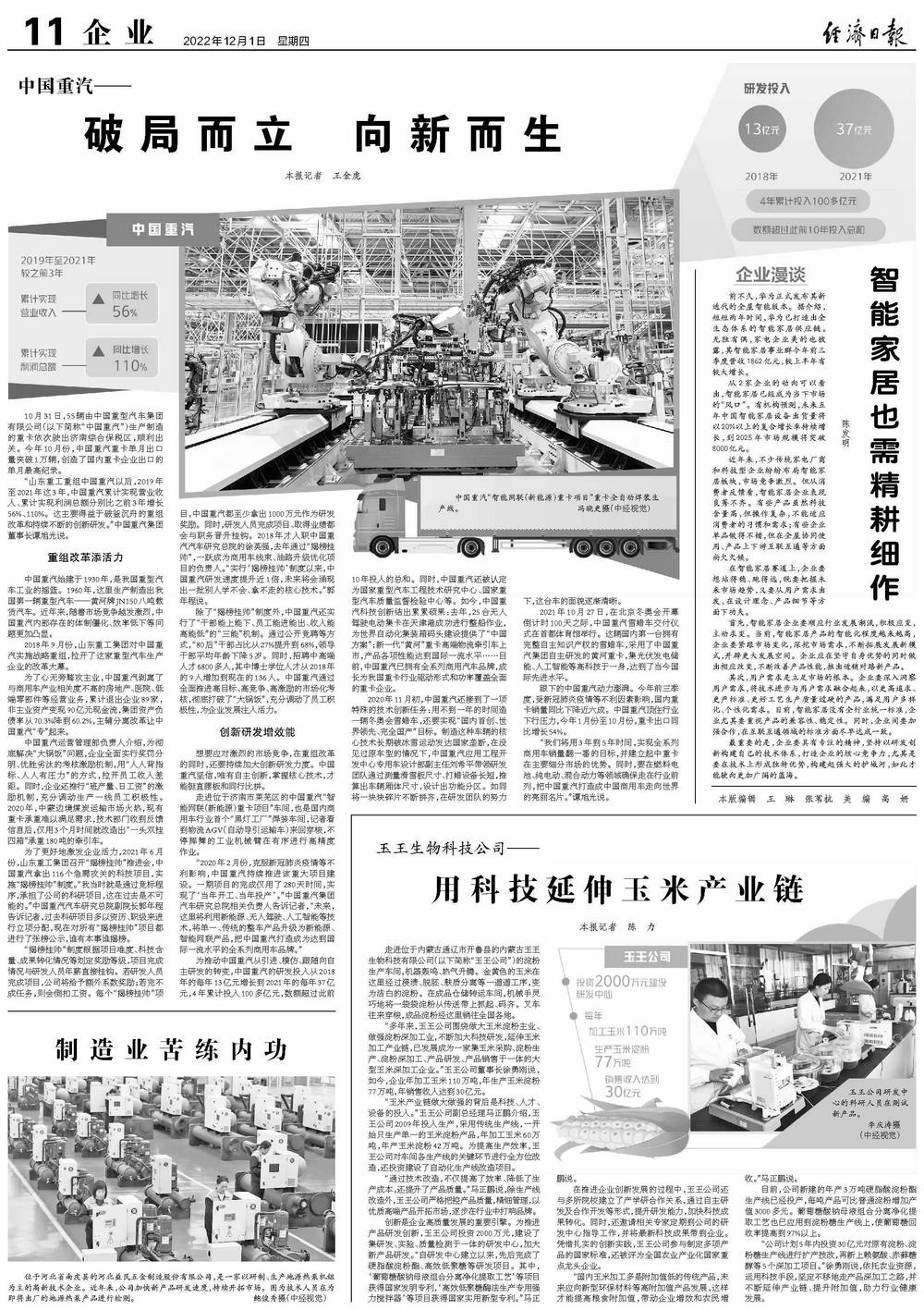 “山东重工重组中国重汽以后,2019年至2021年这3年,中国重汽累计实现营业收入、累计实现利润总额分别比之前3年增长56%、110%。这主要得益于破釜沉舟的重组改革和持续不断的创新研发。”中国重汽集团董事长谭旭光说。