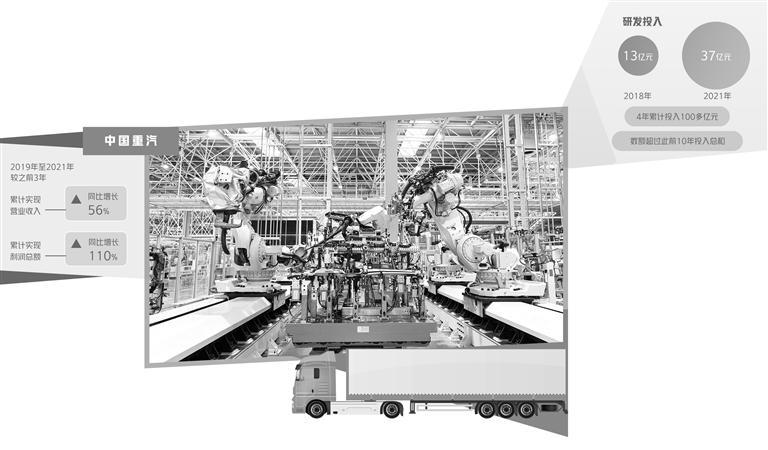 为推动中国重汽从引进、模仿、跟随向自主研发的转变,中国重汽的研发投入从2018年的每年13亿元增长到2021年的每年37亿元,4年累计投入100多亿元,数额超过此前10年投入的总和。同时,中国重汽还被认定为国家重型汽车工程技术研究中心、国家重型汽车质量监督检验中心等。如今,中国重汽科技创新结出累累硕果:去年,25台无人驾驶电动集卡在天津港成功进行整船作业,为世界自动化集装箱码头建设提供了“中国方案”;新一代“黄河”重卡高端物流牵引车上市,产品各项性能达到国际一流水平……目前,中国重汽已拥有全系列商用汽车品牌,成长为我国重卡行业驱动形式和功率覆盖全面的重卡企业。
