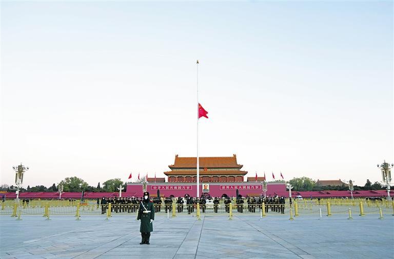 首都北京,天安门广场。12月1日清晨,凛冽寒风中,人们静静肃立。升国旗、下半旗仪式开始。