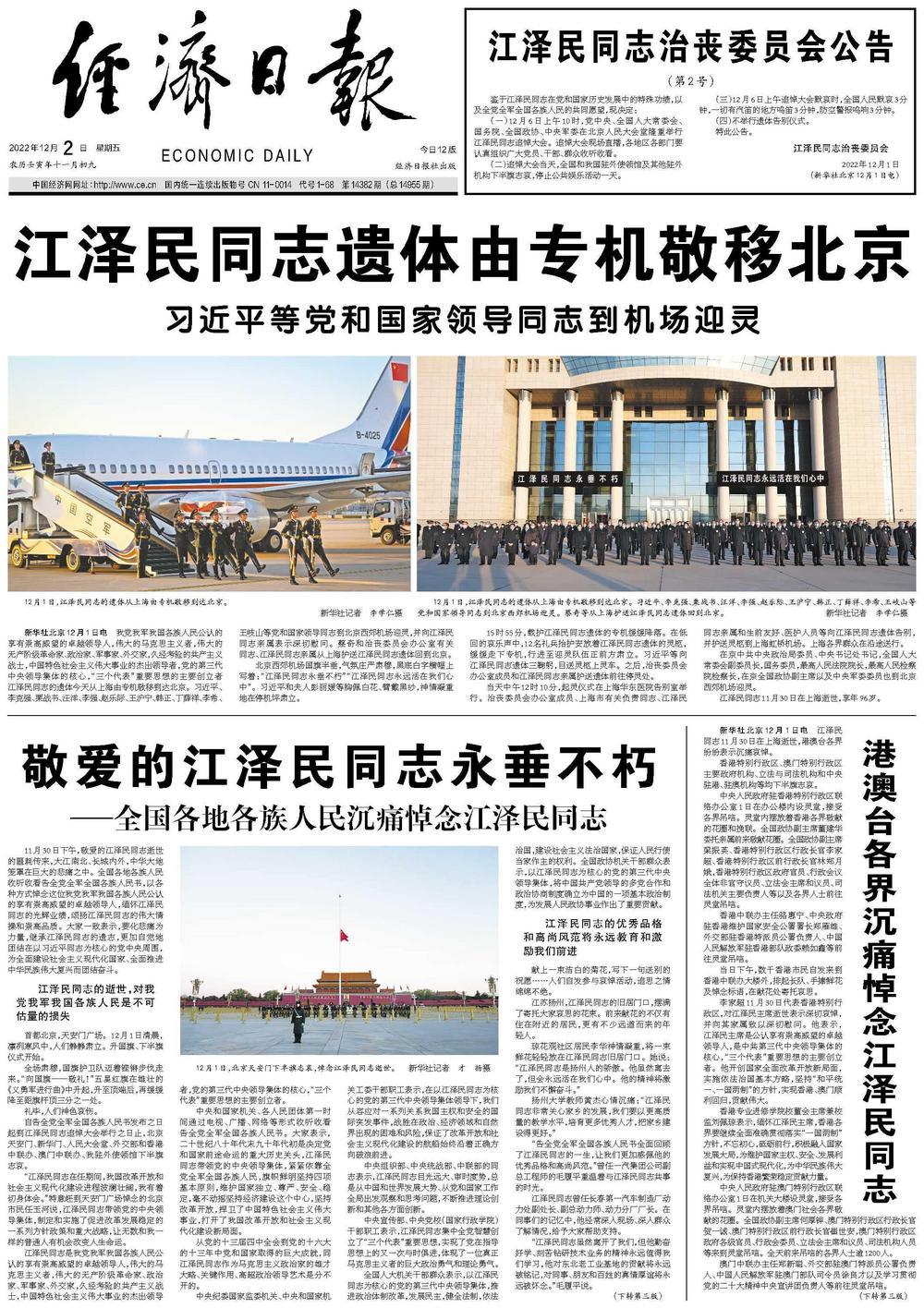 自告全党全军全国各族人民书发布之日起到江泽民同志追悼大会举行之日止,北京天安门、新华门、人民大会堂、外交部和香港中联办、澳门中联办、我驻外使领馆下半旗志哀。