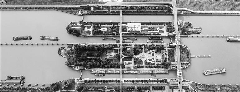 11月30日,京杭大运河(江苏淮安段),货船有序通过淮安船闸。淮安航务中心淮安船闸开辟水上“绿色通道”,优化电煤、粮食等重点保供物资运输,全力保障沿线企业生产需求和群众生活供应。