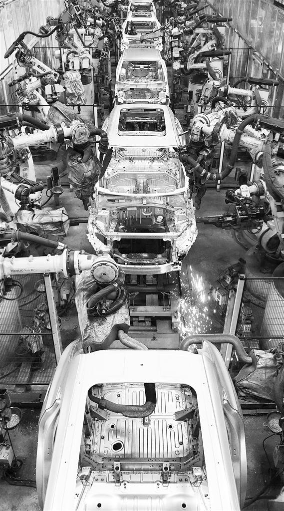 ◀11月17日,位于山东省烟台开发区的上汽通用东岳汽车有限公司,工业机器人在组装汽车。目前烟台已拥有汽车及零部件生产企业420余家。今年前三季度,烟台汽车制造业规上工业增加值增长14.7%。唐 克摄(中经视觉)