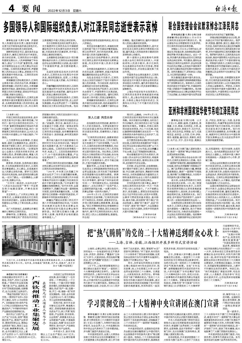 当天早些时候,古特雷斯发表声明,对江泽民逝世深表悲痛,并代表联合国向江泽民的家人以及中国政府和人民致以诚挚慰问。声明说,江泽民坚定不移倡导中国参与国际事务,在他的任期内,中国取得巨大经济进步并成功加入世界贸易组织。
