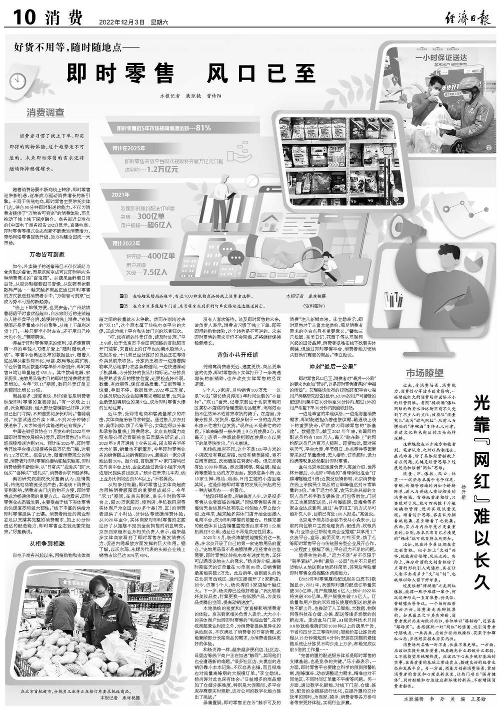 商品更多、速度更快、时间更省是消费者钟爱即时零售的重要原因。“有一次晚上11点,我急需信封,但大部分店铺都已打烊,如果自己出门寻购,不知道要花多长时间。”曹萌萌说,“我尝试通过外卖下单,不到20分钟骑手便送来了,我才知道外卖能送的还有很多。”