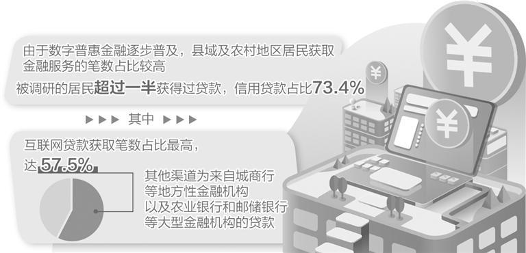 报告还显示,利率低、还款方式和周期灵活被普遍认为是影响县域居民贷款决策的优先考虑因素。由于数字贷款额度更小且还款方式更灵活,进一步为小规模的下沉客户提供了补充服务。由于数字普惠金融的逐步普及,县域及农村地区居民获取金融服务的笔数占比较高,被调研的居民超过一半获得过贷款,信用贷款占比73.4%。其中,互联网贷款获取笔数占比最高,占57.5%,其他渠道为来自城商行、农商行、村镇银行等地方性金融机构,以及农业银行和邮储银行等大型金融机构的贷款。