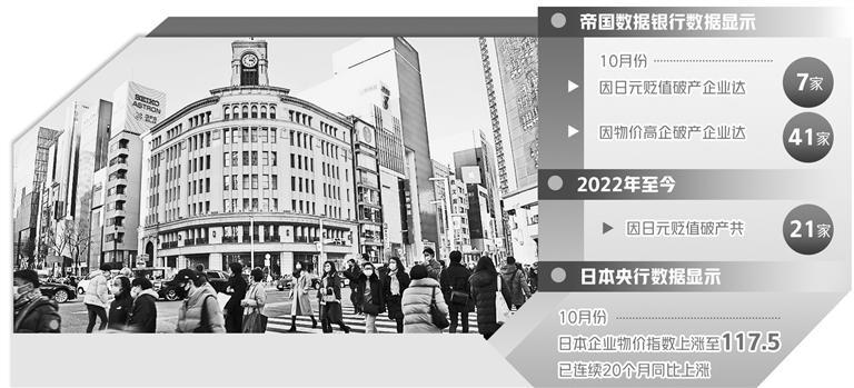 近日,日本信用调查机构帝国数据银行公布了10月份日本因日元贬值破产和“高物价破产”企业情况。数据显示,10月份,日本因日元贬值而破产的企业达到7家,与上月持平,本年度以来共21家,创5年来新高。因物价高企而破产的企业达41家,超过了9月份的35家,连续4个月刷新纪录。